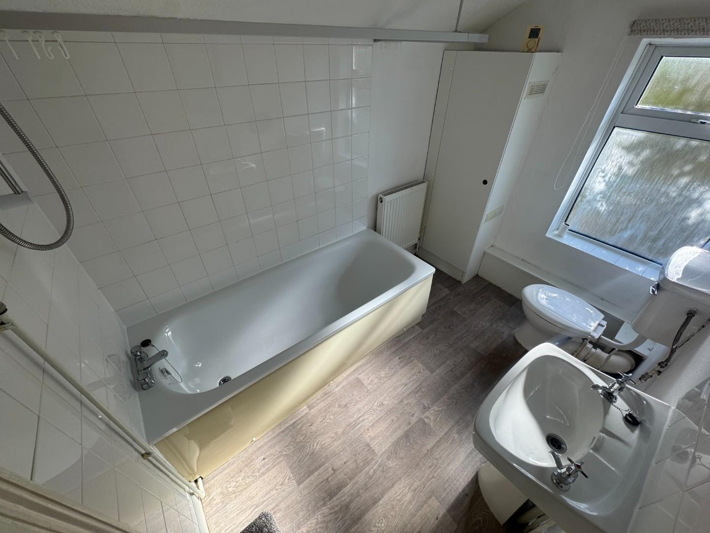 The bathroom is neatly presented with a full-size bathtub, wall-mounted shower, washbasin and toilet. It benefits from a window for ventilation and natural light, and has a clean, practical finish.
