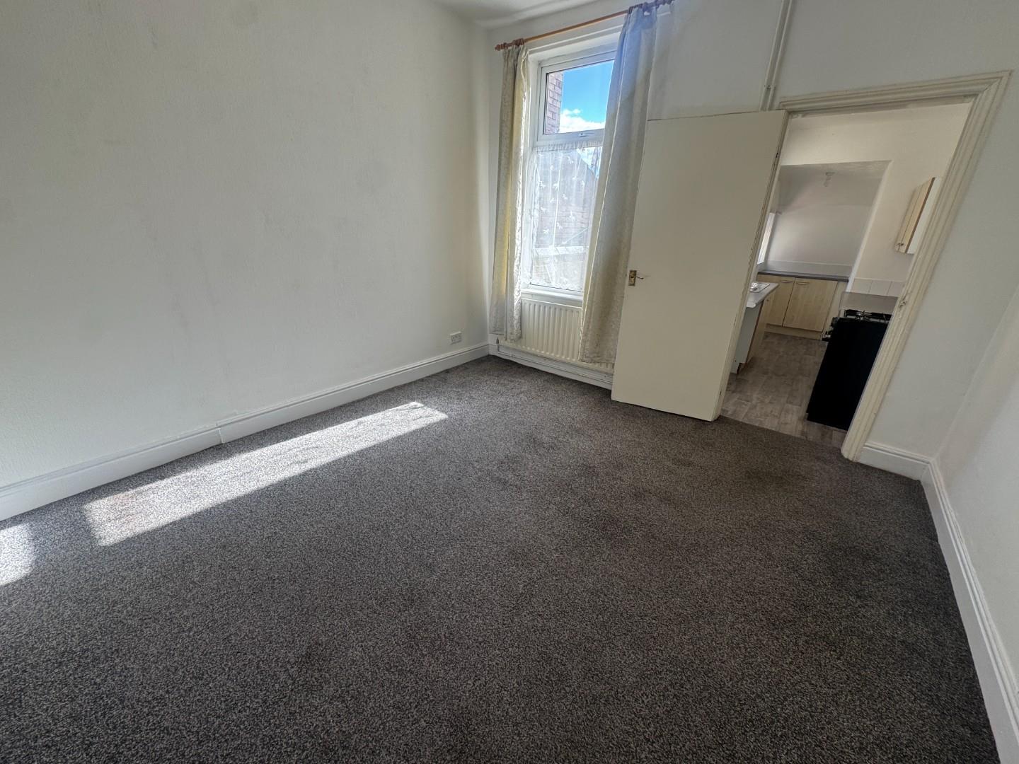 This double bedroom is a bright and comfortable space, with a large window overlooking the street. It features neutral decor and soft carpeting, creating a restful environment.