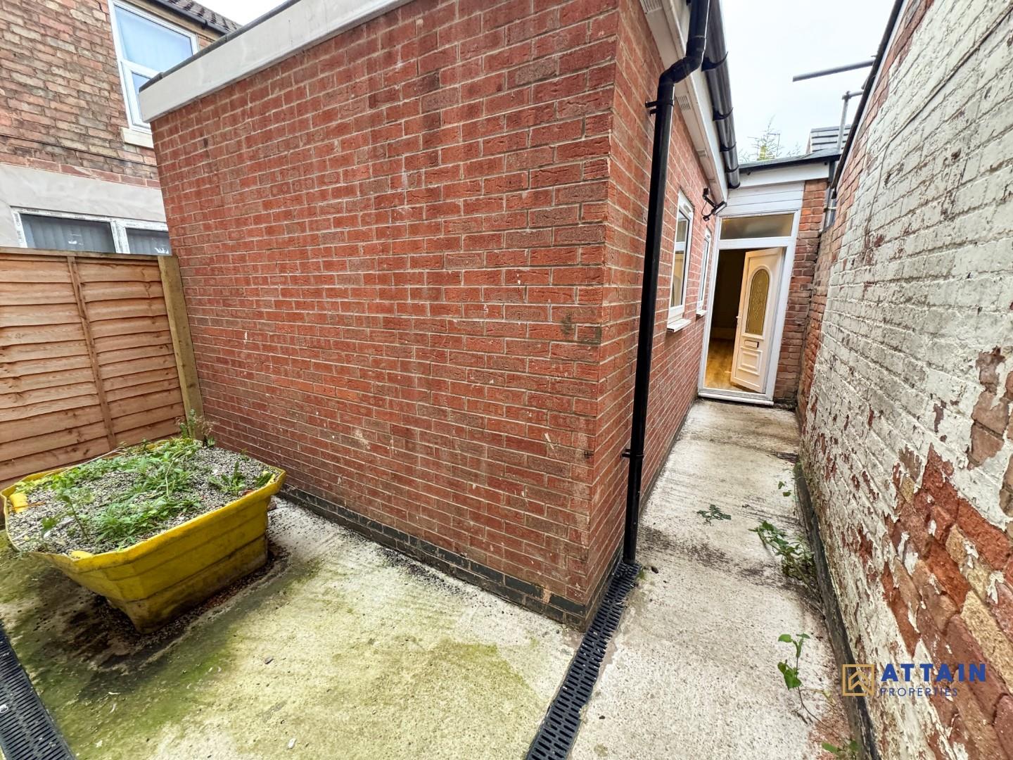 An external courtyard with brick walls on either side and a small planted area in a yellow planter. The space is paved with concrete and offers a secure, private outdoor area, accessible directly from the interior, ideal for minimal outdoor seating or gardening.