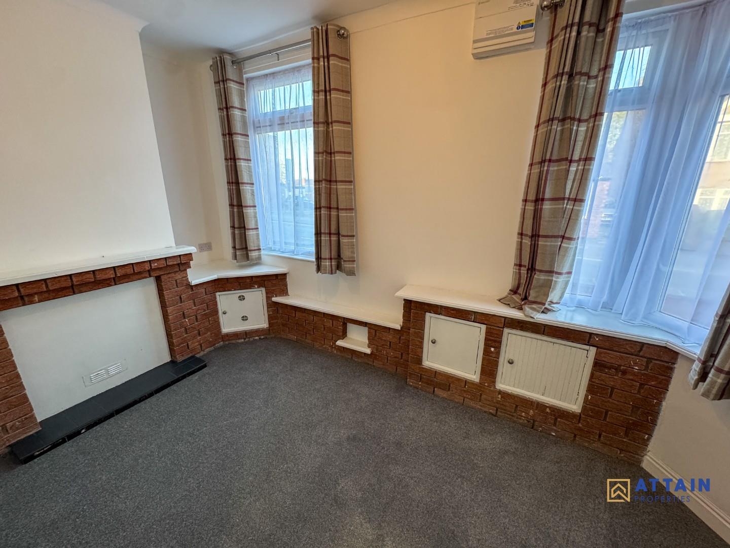 A second living room space is presented with carpeted flooring and a large window that draws in plenty of natural light. The room's layout provides a versatile space that could be utilised as a formal sitting room or a dining area.