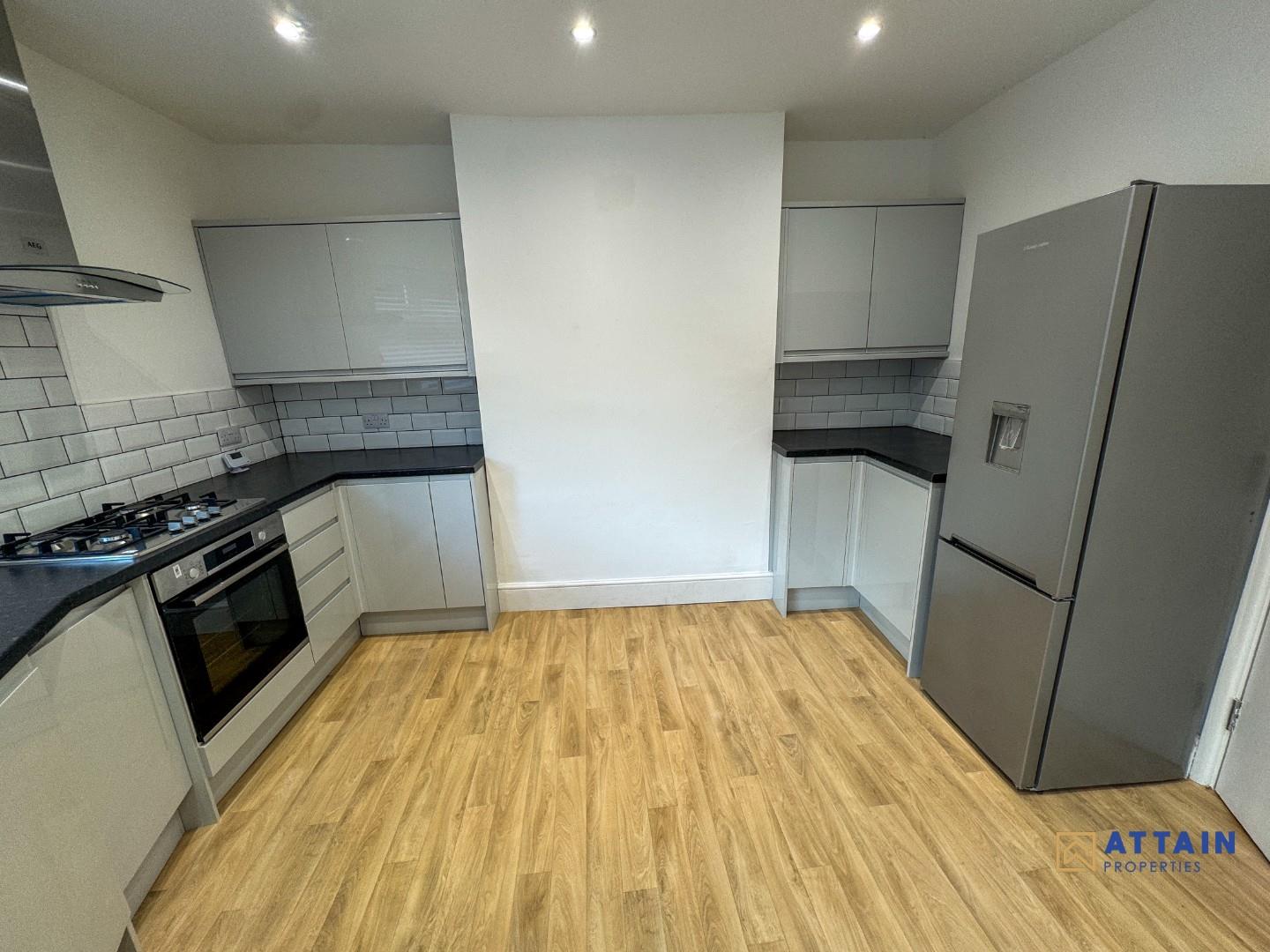 This kitchen is equipped with a range of modern base and wall units with contrasting dark work surfaces. The space accommodates essential appliances including a washing machine, oven, and a tall fridge freezer. A window fills the room with natural light, complemented by the warm wood-effect flooring and tiled splashbacks, creating a practical and inviting cooking area.