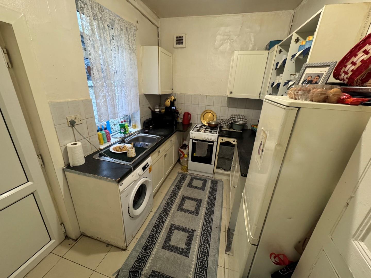 The kitchen is compact yet functional, equipped with a range of fitted units and work surfaces. There is space for a washing machine and other appliances, with a window providing natural light. The layout maximises the use of space, making it suitable for everyday cooking and food preparation.